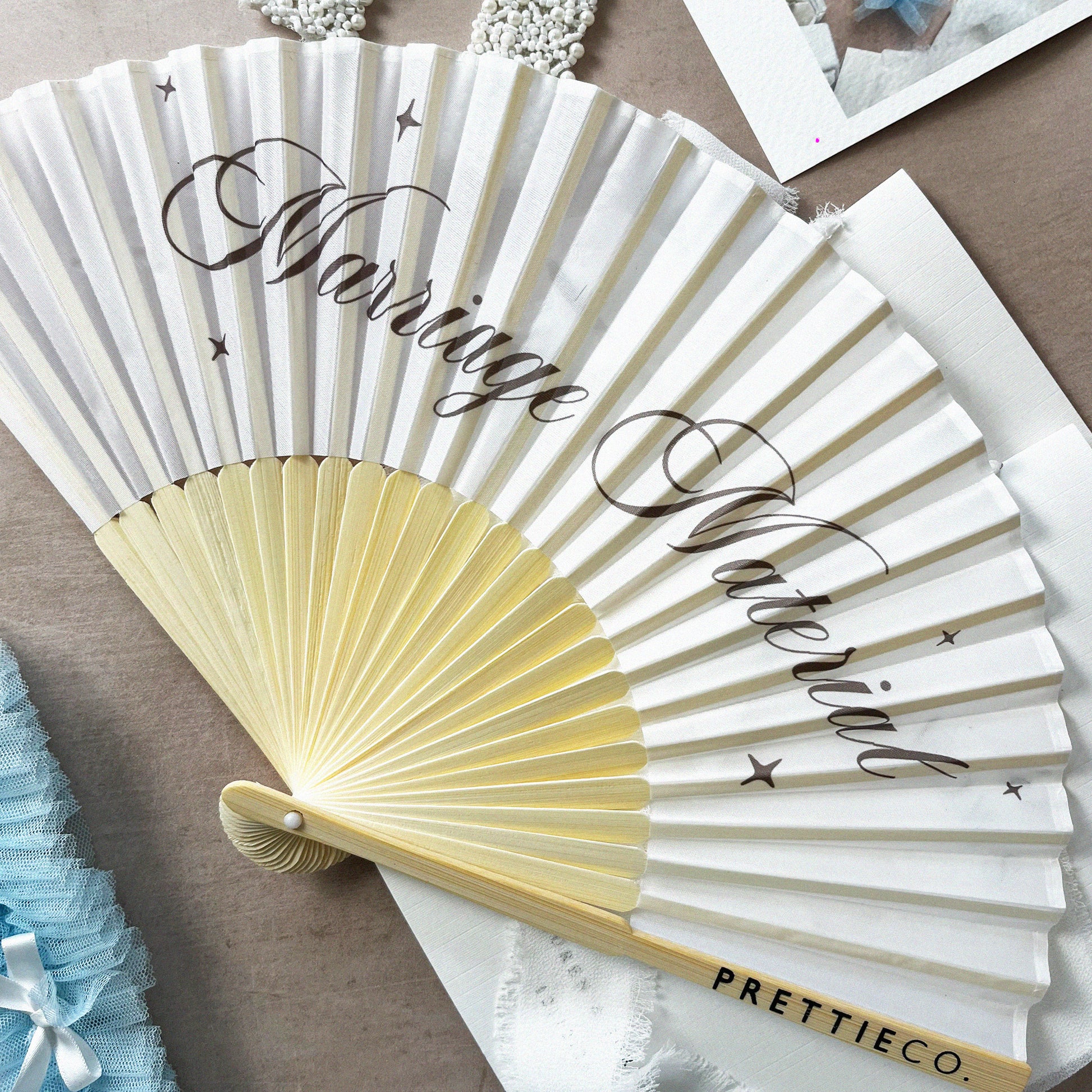 Designed in soft ivory silk with natural wood detailing and our PrettieCo. logo, these dreamy fans are the perfect accessory for brides, bridesmaids, and wedding mornings.