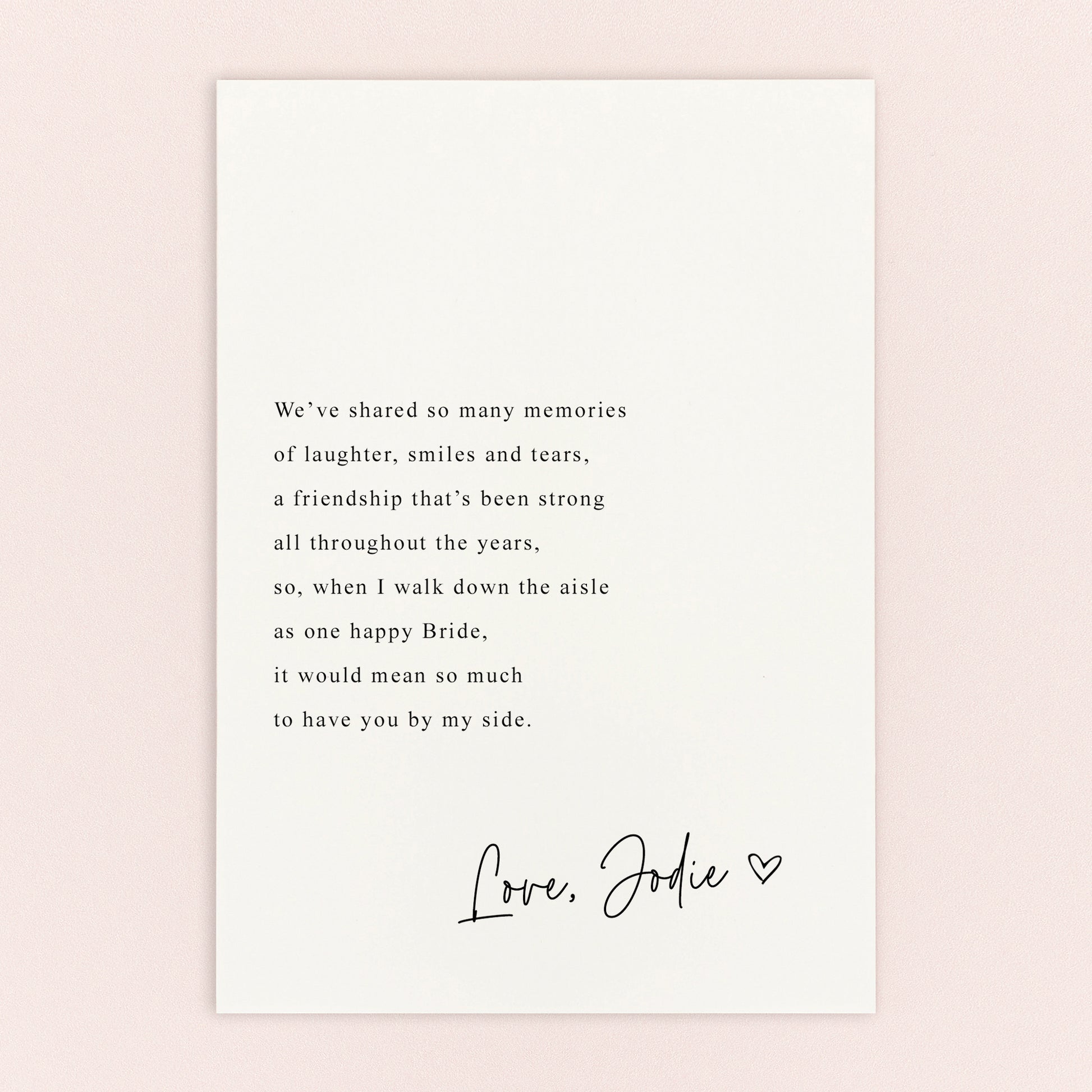 Personalised Will You Be My Bridesmaid Card! The perfect way to ask your bestie to special to be part of your big day. Our wedding stationery is fabulously designed and printed with love. These A6 postcards are double-sided and come with FREE envelopes. You can add your own special message too!