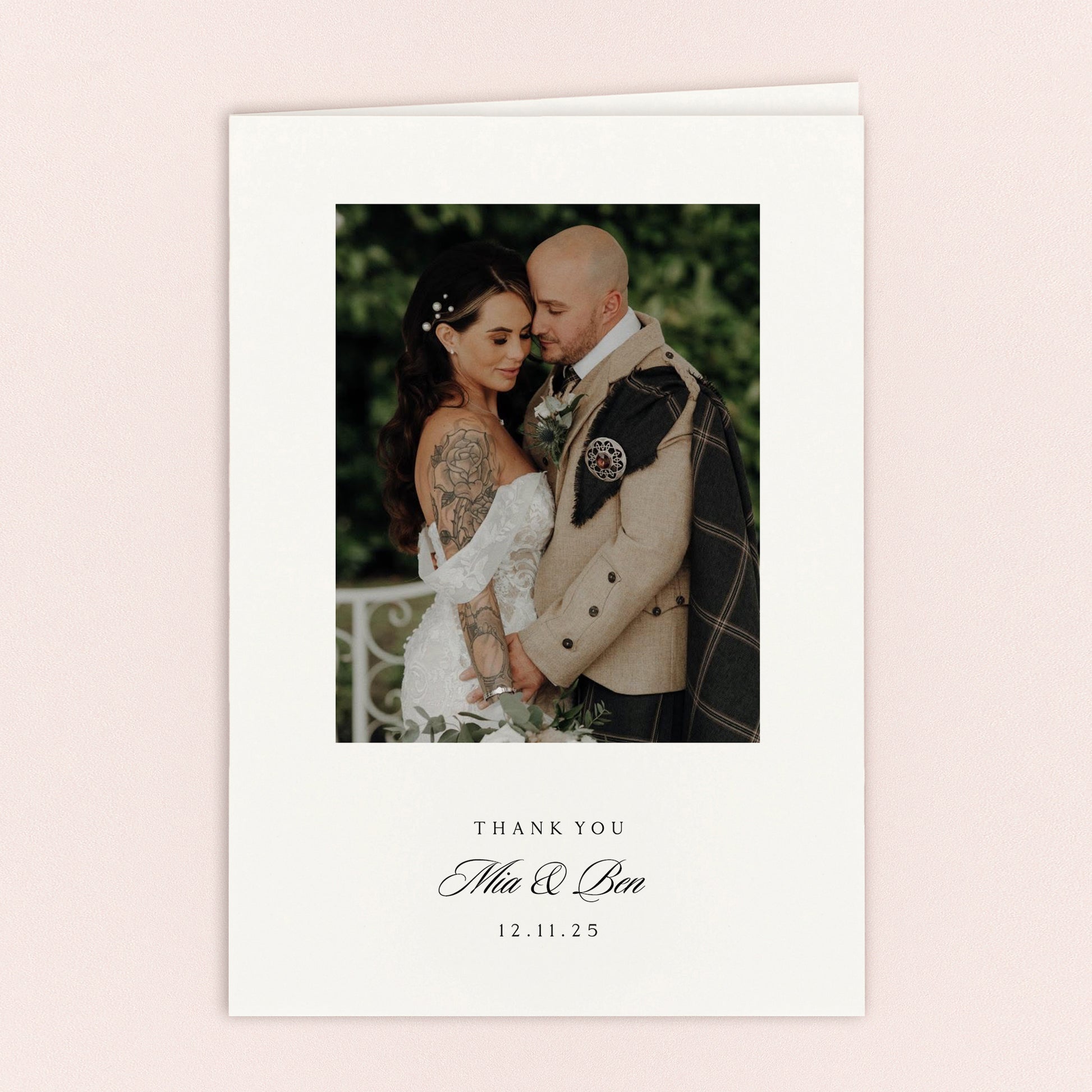 A softly romantic take on a wedding thank you card. The Classic Thank You pairs colour photography with elegant typography in a minimal layout. Printed as folded cards on luxury cardstock. This is a fixed design personalised with your name, date and photo.