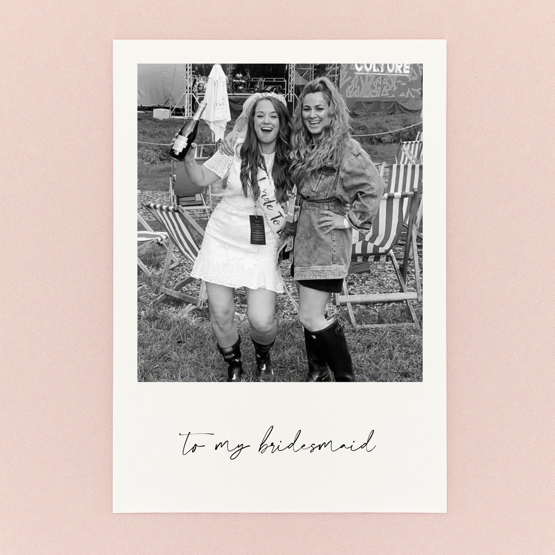 Introducing our classic folded "To My Bridesmaid" photo card—a perfect blend of simplicity and modern style. The understated design highlights your cherished photo and heartfelt message, making it a memorable keepsake for your bridal party.